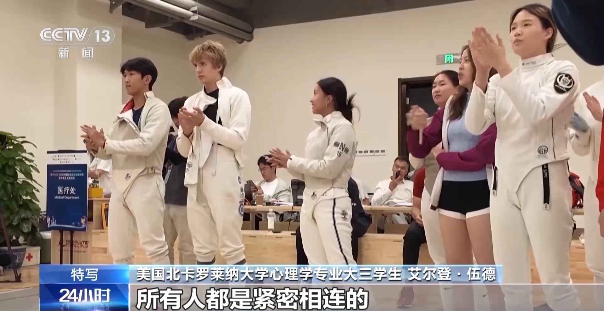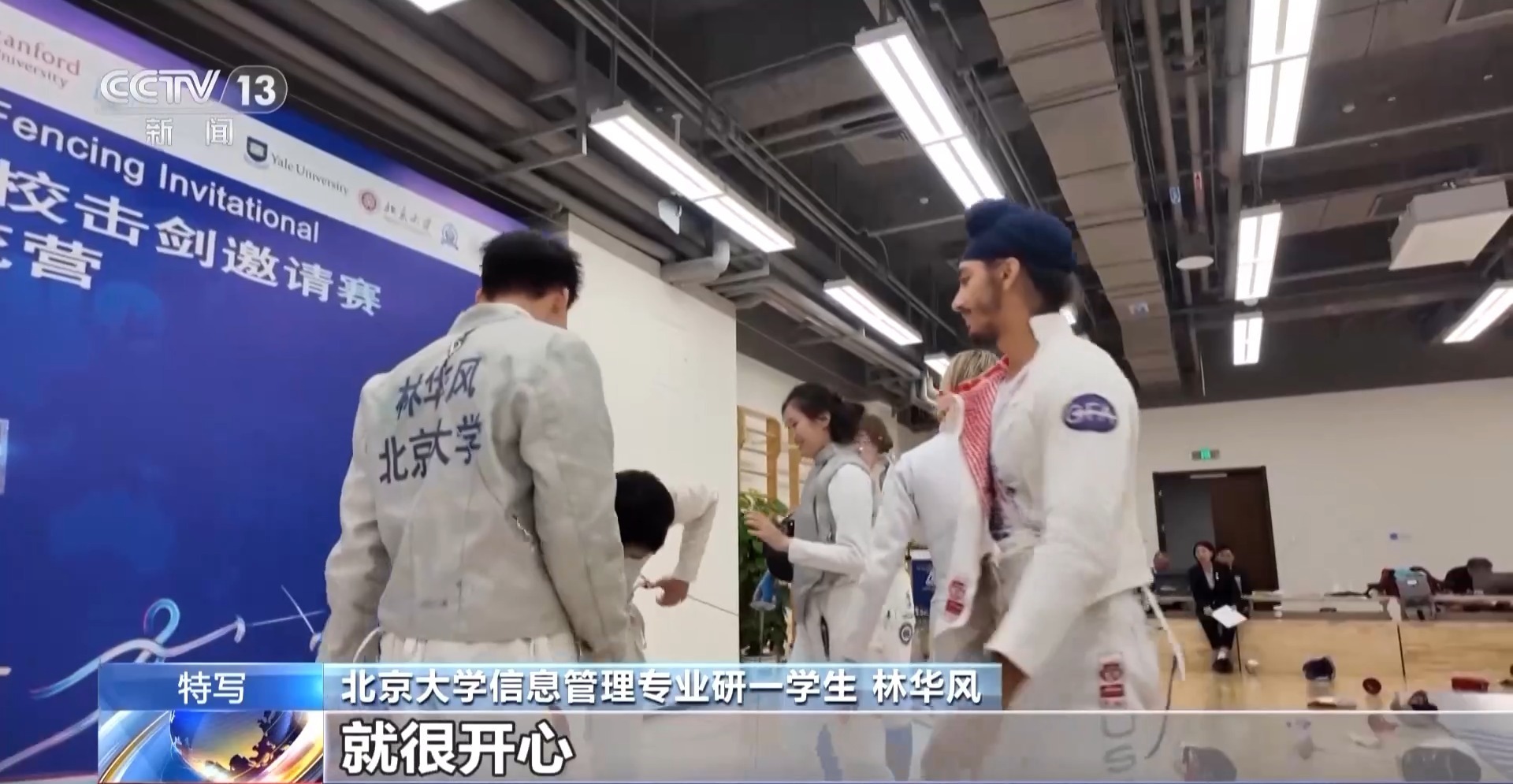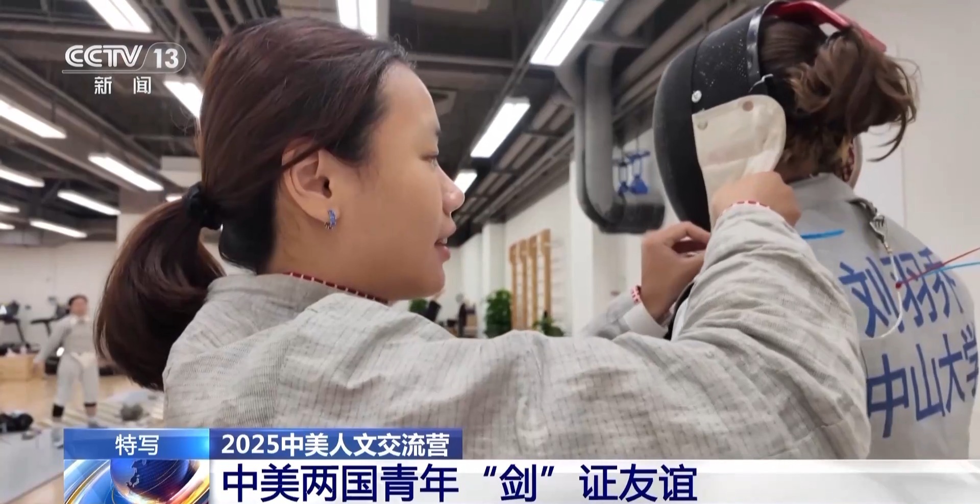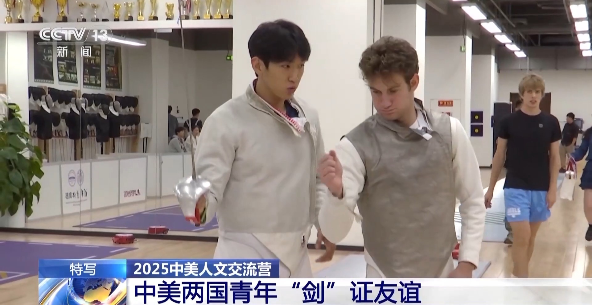 总台央视记者 周培培:在清华大学击剑馆,来自中美两国顶尖高校的大学生,正在以一把剑开启一场特别的对话。在我身后正在进行的是团体赛,由中国学生和美国学生混合编队,这样的融合组队方式,让中美青年有更多的机会交流,越走越近。